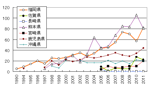 - 日本では他地域のような減少は見られず、前年の記録より11羽多い数字となった。県別に見ると、福岡県の82羽が最も多く、次いで1羽差で熊本県の81羽、鹿児島県の44羽が上位であった。前年と比べると、福岡県と熊本県の順位が逆転している。