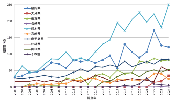 2020年、日本国内では、前年より6羽多く、計544羽が確認されました(1.1%増)。熊本県が最も多く226羽が観察され、次いで、福岡県89羽、佐賀県78羽、鹿児島県69羽、山口県31羽等となっています。