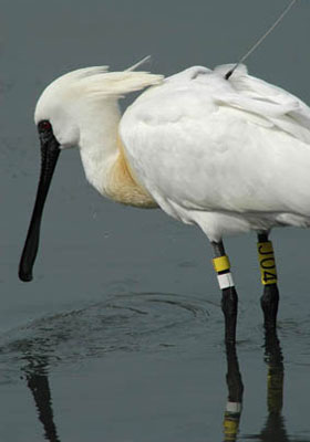 渡り経路の追跡には、越冬地でクロツラヘラサギを捕獲して送信機を装着し、アルゴスシステムを用いた人工衛星による追跡調査を行いました。また捕獲したすべての個体には、金属足環および目視で個体識別のできるカラーリングを装着しました。