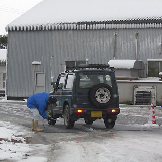 関係者等で許可を得て規制区域に出入りする車両には、念入りな消毒が行われています。