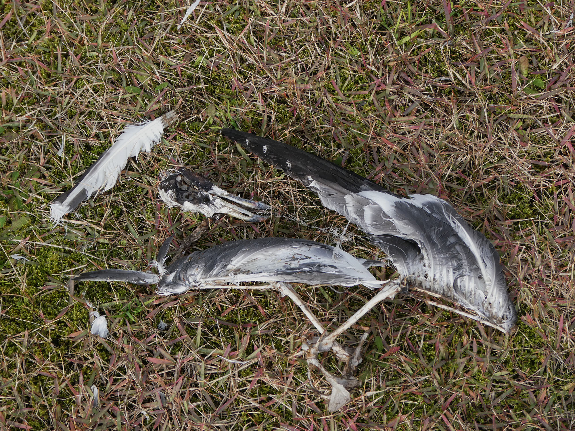 - 釣り糸と思われるものが絡まり死んでいた。死骸はバラバラになっていた。