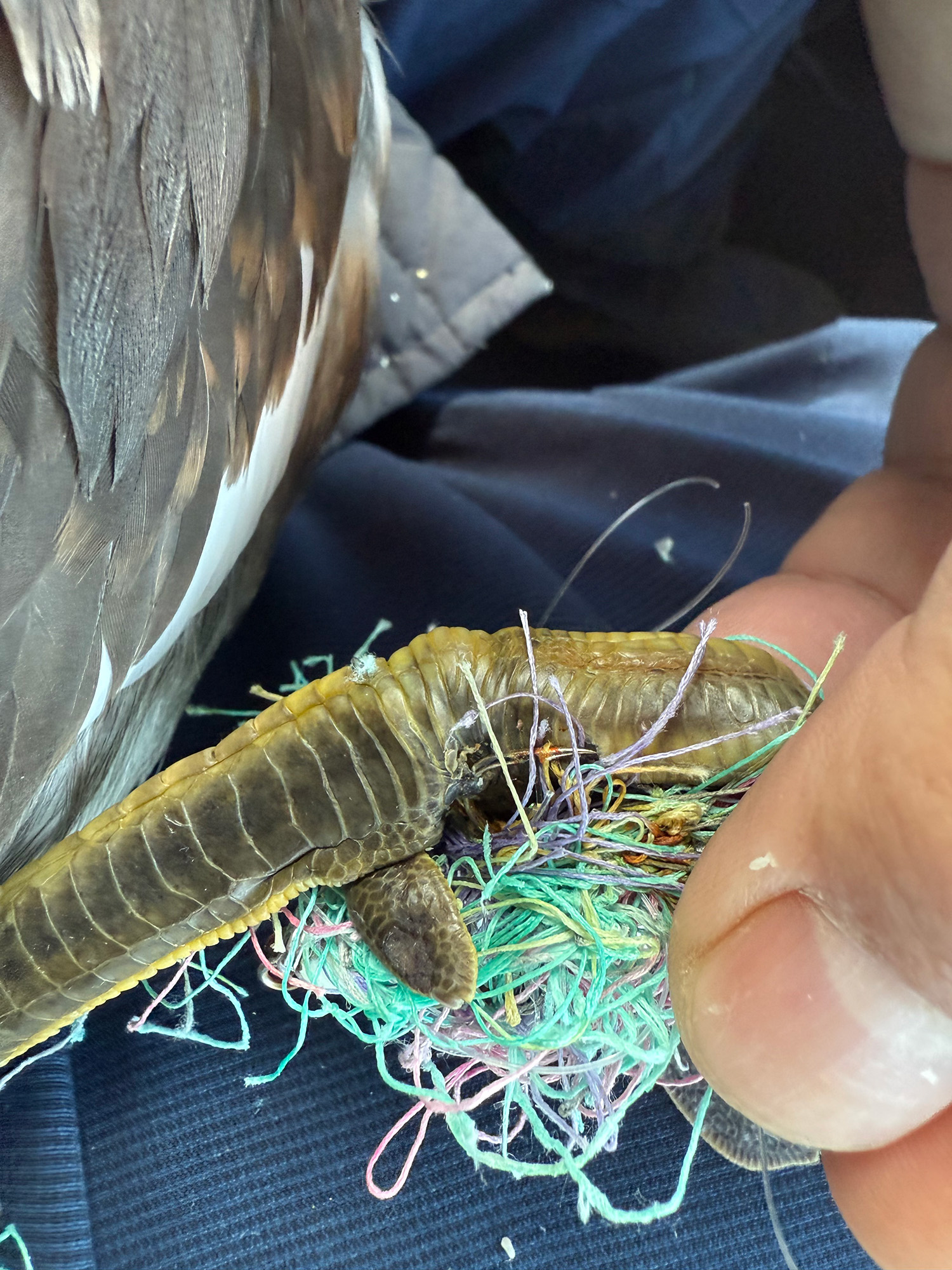 - 右の翼に投げ釣りの仕掛けが絡まっていた。
