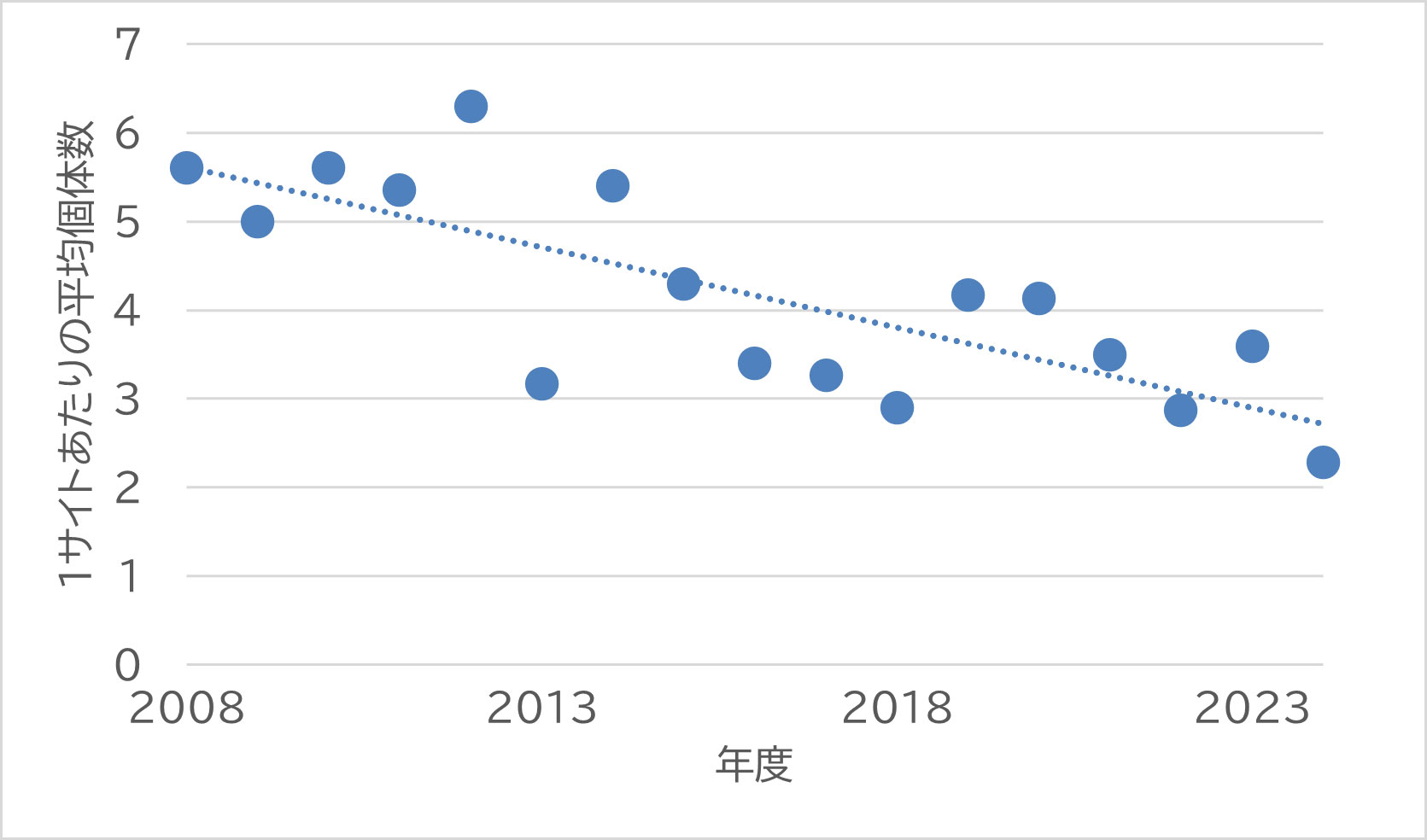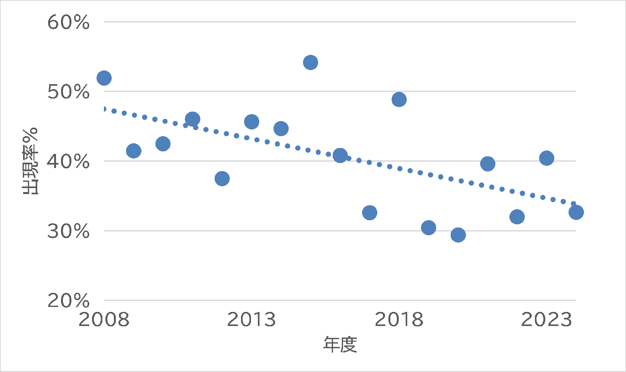 出現率の経年変化では、当初からみると徐々に減少していることがわかり、なんと個体数では15年で約半数に激減していることがわかりました。