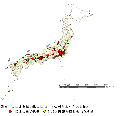 ツバメ減少の要因について、自由表記で回答のあった情報を集計すると、カラスによる影響が296件、またフンで汚れるなどの理由から巣が人の手で壊されている事例が216件と上位に挙がってきました(表2)。これを地図に示してみると、この2つの要因は都市近郊で多く見られました(図5、6)。