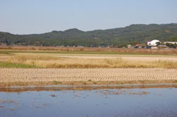 水田に水をはって、ツルたちが夜を過ごすためのねぐらをつくっています。ツルたちは回りが見渡せる、浅い水の中にねぐらをとります。越冬したツルだけでなく、渡りの途中で立ち寄ったツルもこの水田でねぐらをとります。また、カモの仲間も数多く飛来しています。 |